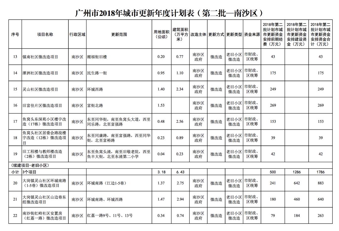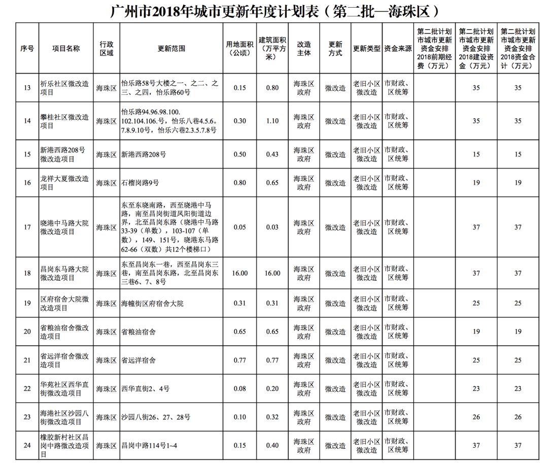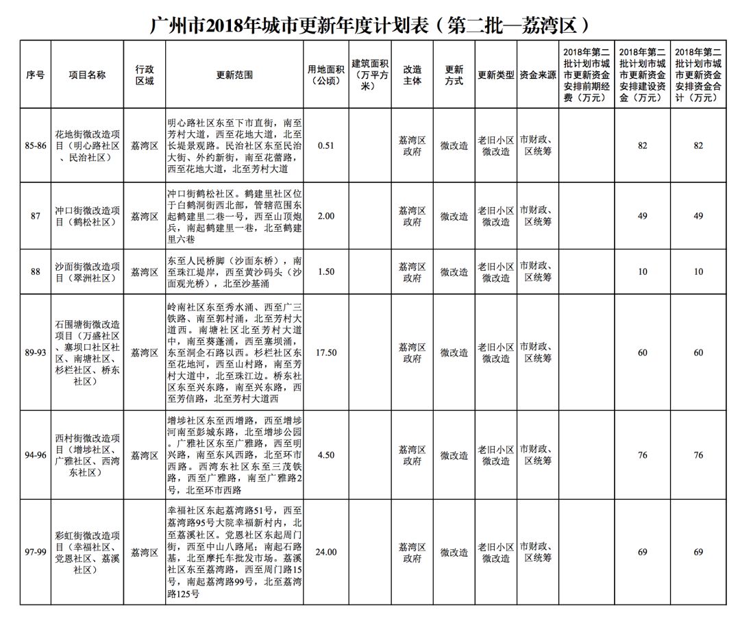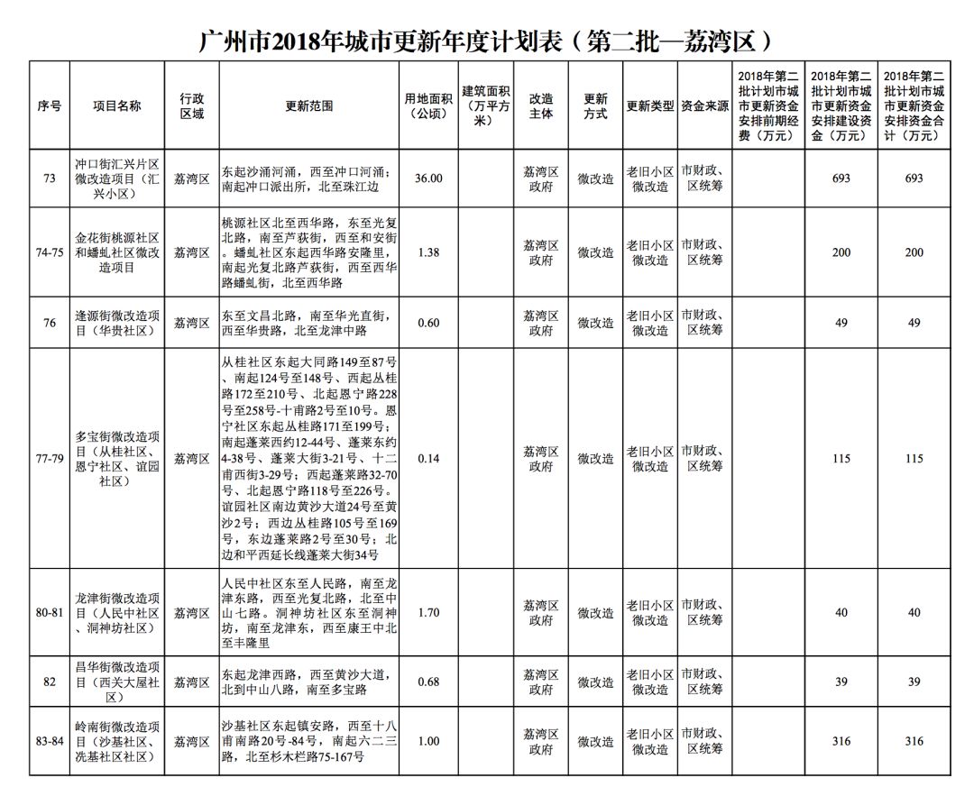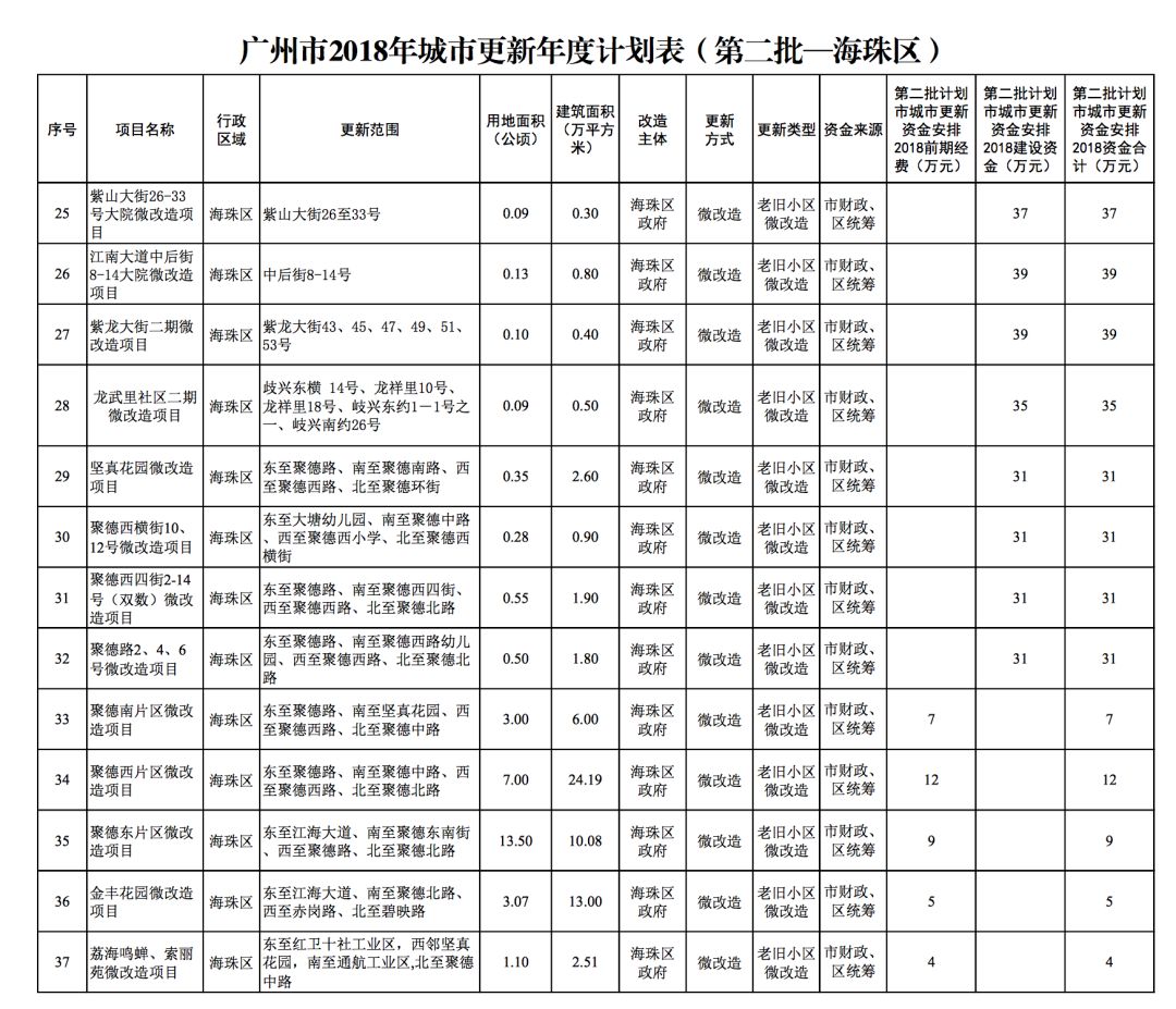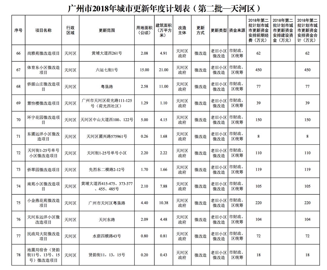 今年5月,市政府审议通过了《广州市2018年城市更新年度计划(第二批)》,列入本次计划的正式项目共计428个、25.93平方公里。其中老旧小区微改造项目422个、24.20平方公里;片区策划项目1个、1.23平方公里;旧村庄综合整治项目1个、0.42平方公里;国有土地旧厂自主改造项目3个、0.06平方公里;土地整备或政府收储项目1个、0.02平方公里。