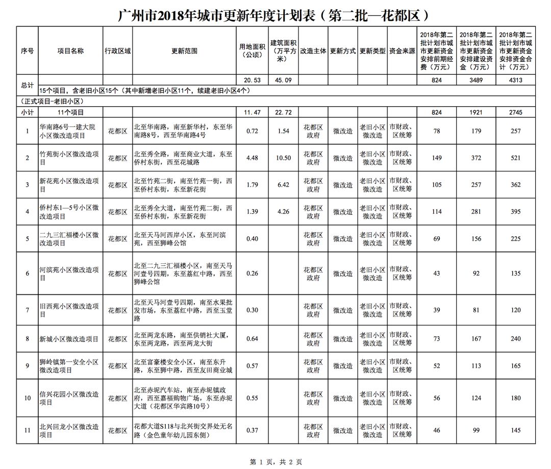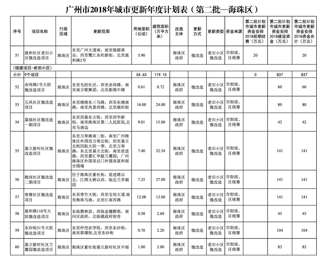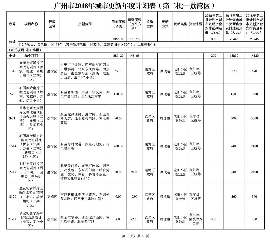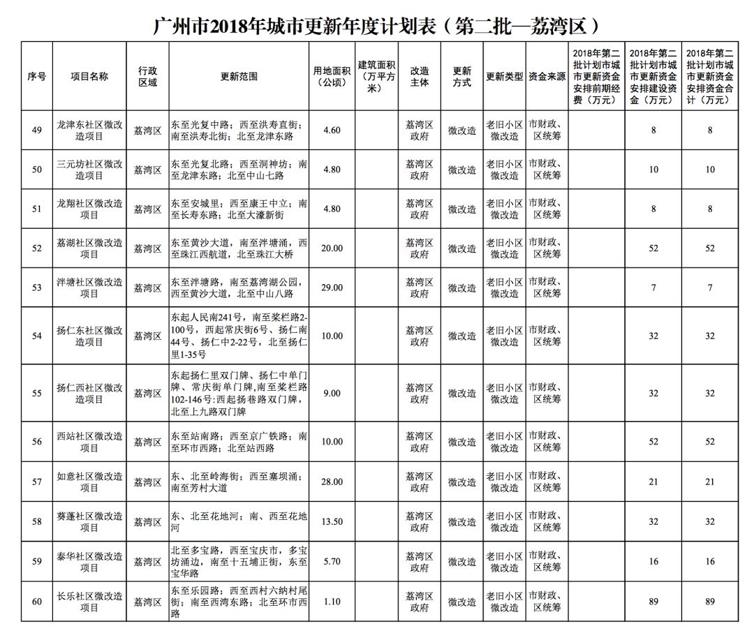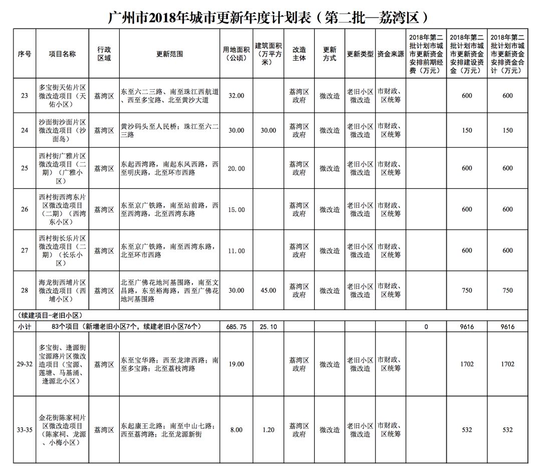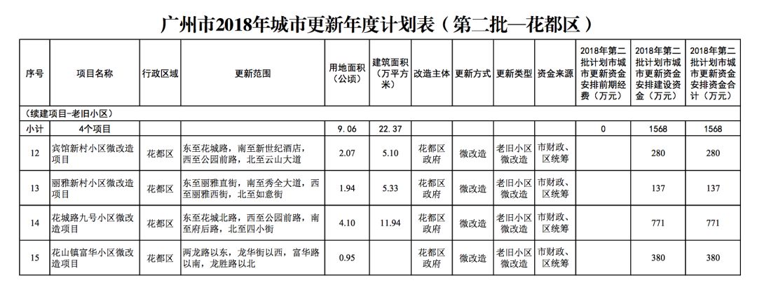 今年5月,市政府审议通过了《广州市2018年城市更新年度计划(第二批)》,列入本次计划的正式项目共计428个、25.93平方公里。其中老旧小区微改造项目422个、24.20平方公里;片区策划项目1个、1.23平方公里;旧村庄综合整治项目1个、0.42平方公里;国有土地旧厂自主改造项目3个、0.06平方公里;土地整备或政府收储项目1个、0.02平方公里。