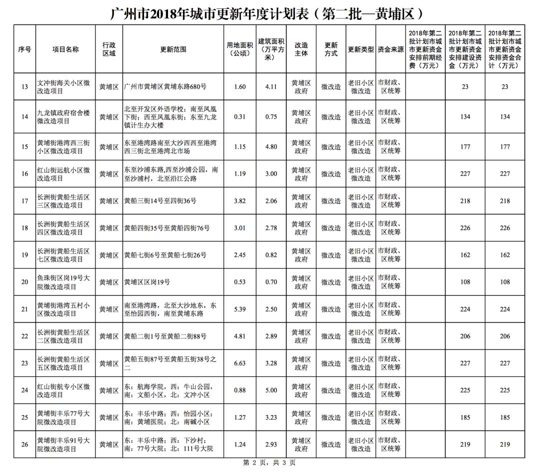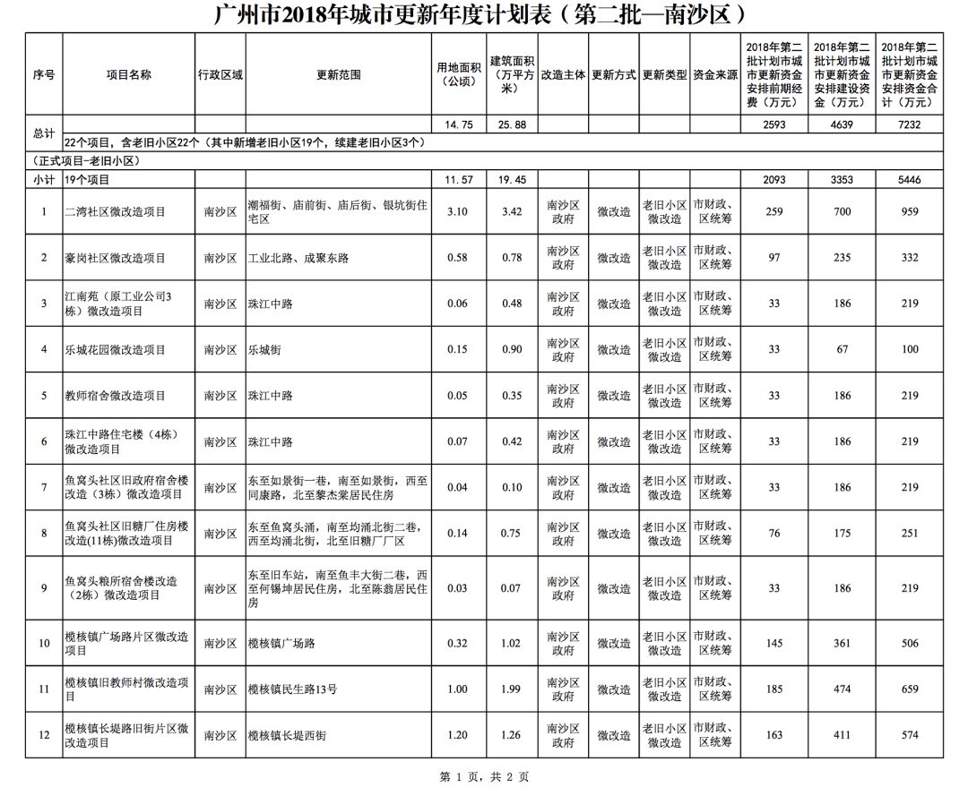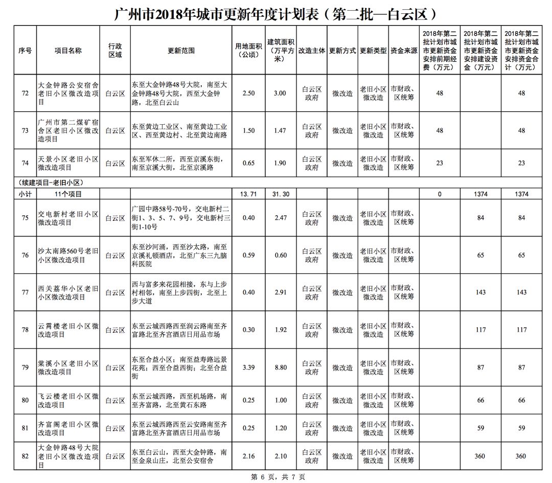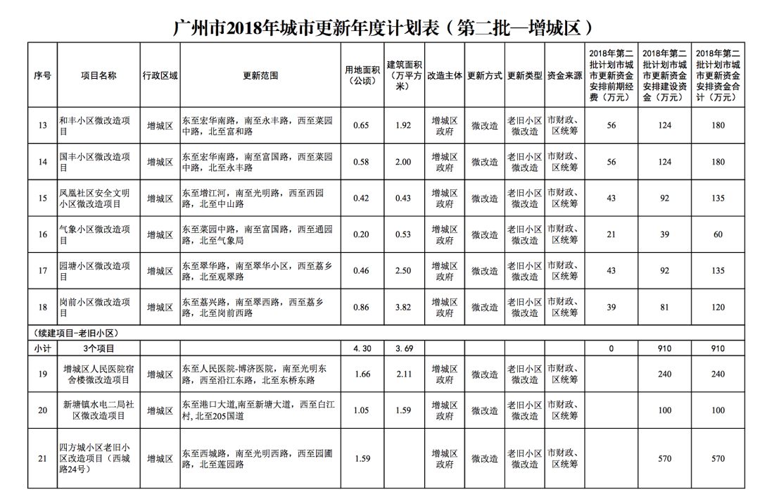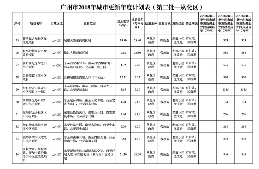 今年5月,市政府审议通过了《广州市2018年城市更新年度计划(第二批)》,列入本次计划的正式项目共计428个、25.93平方公里。其中老旧小区微改造项目422个、24.20平方公里;片区策划项目1个、1.23平方公里;旧村庄综合整治项目1个、0.42平方公里;国有土地旧厂自主改造项目3个、0.06平方公里;土地整备或政府收储项目1个、0.02平方公里。
