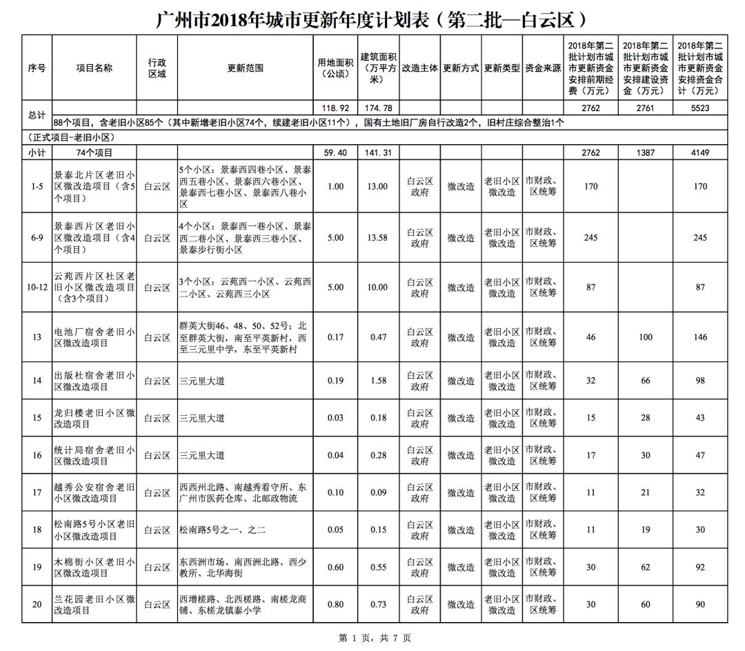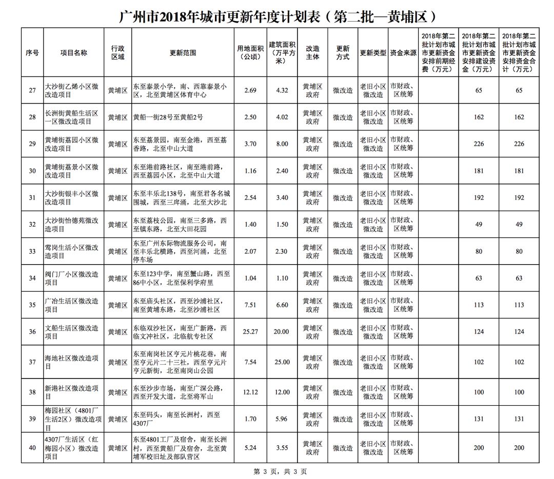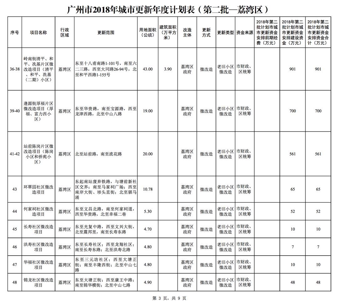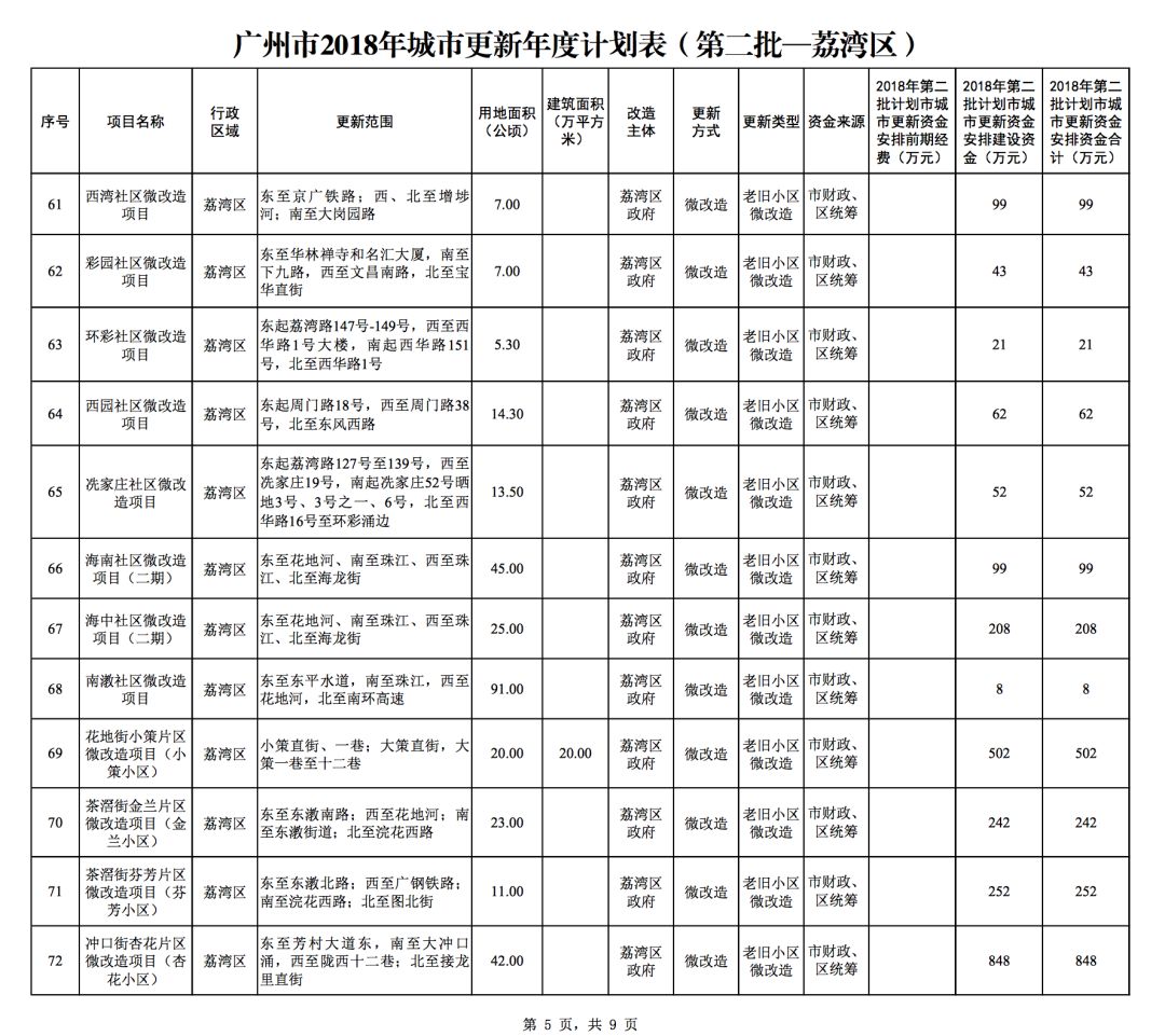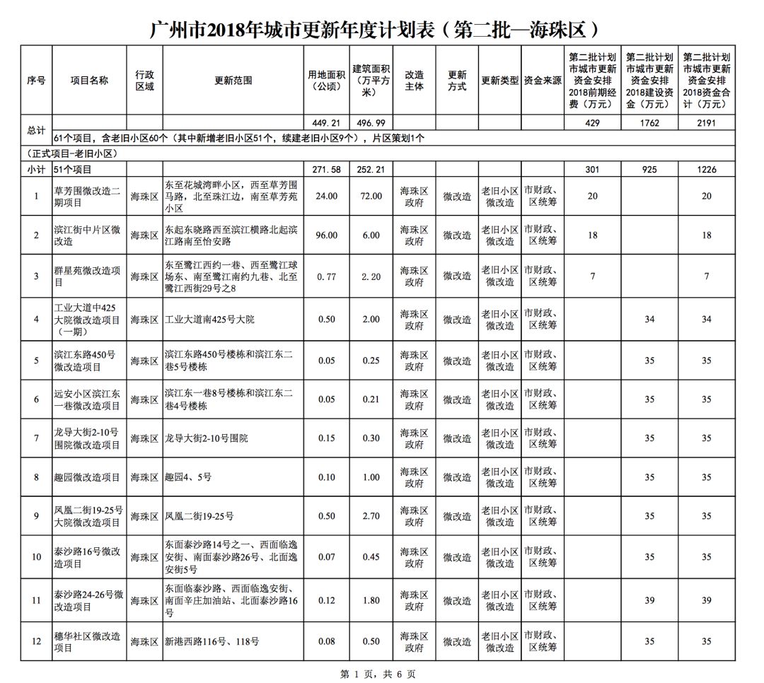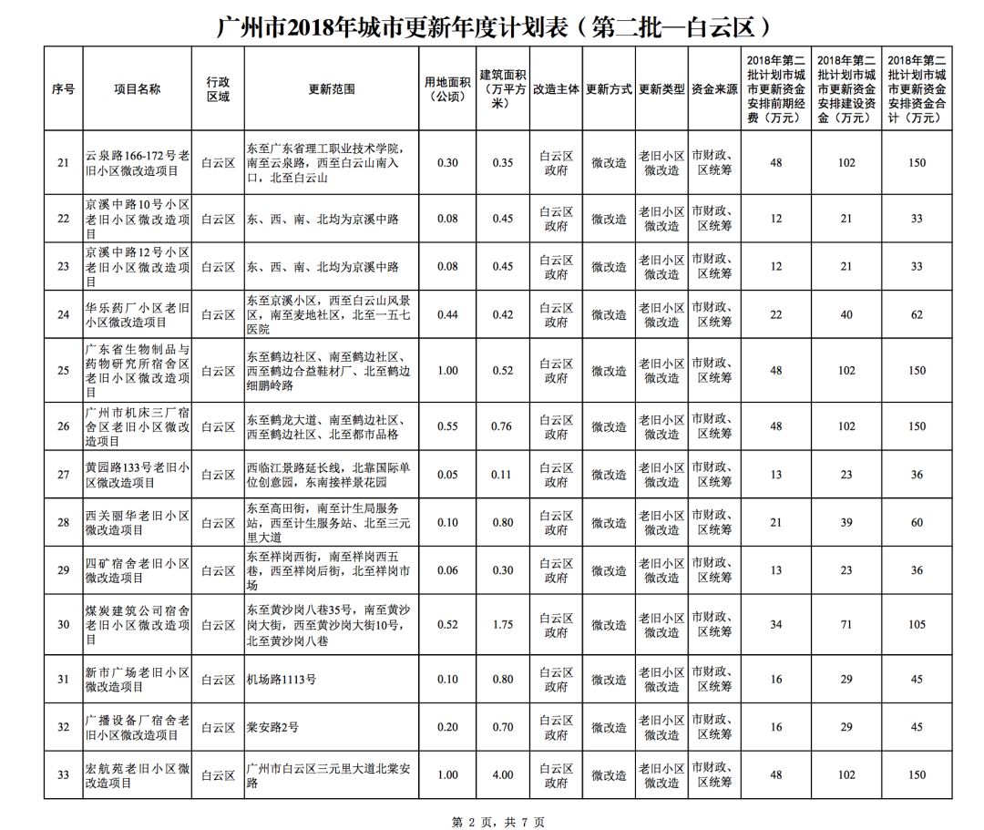 今年5月,市政府审议通过了《广州市2018年城市更新年度计划(第二批)》,列入本次计划的正式项目共计428个、25.93平方公里。其中老旧小区微改造项目422个、24.20平方公里;片区策划项目1个、1.23平方公里;旧村庄综合整治项目1个、0.42平方公里;国有土地旧厂自主改造项目3个、0.06平方公里;土地整备或政府收储项目1个、0.02平方公里。