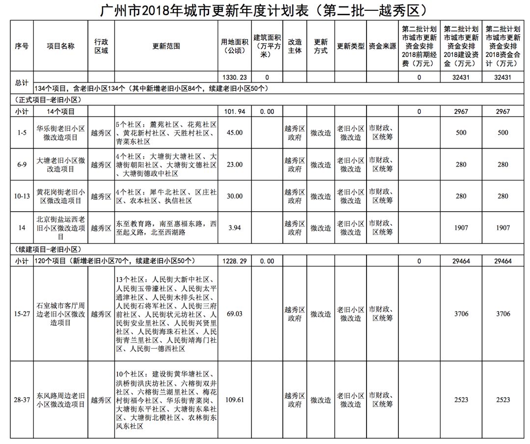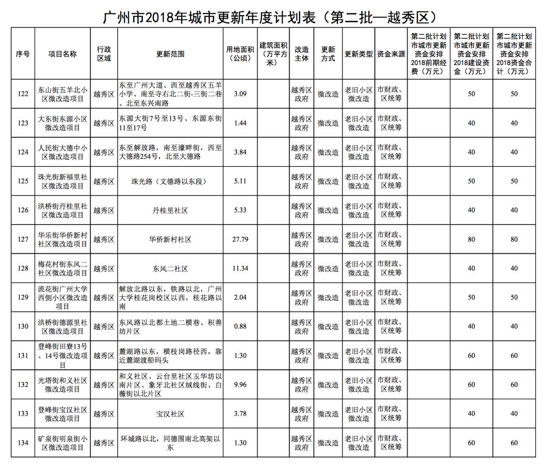 134个改造项目,均是老旧小区微改造(含续建)。对比第一批的25个小区,越秀这次“加码”非常给力。而且安排资金也增加到3.24亿元,翻了好几倍。